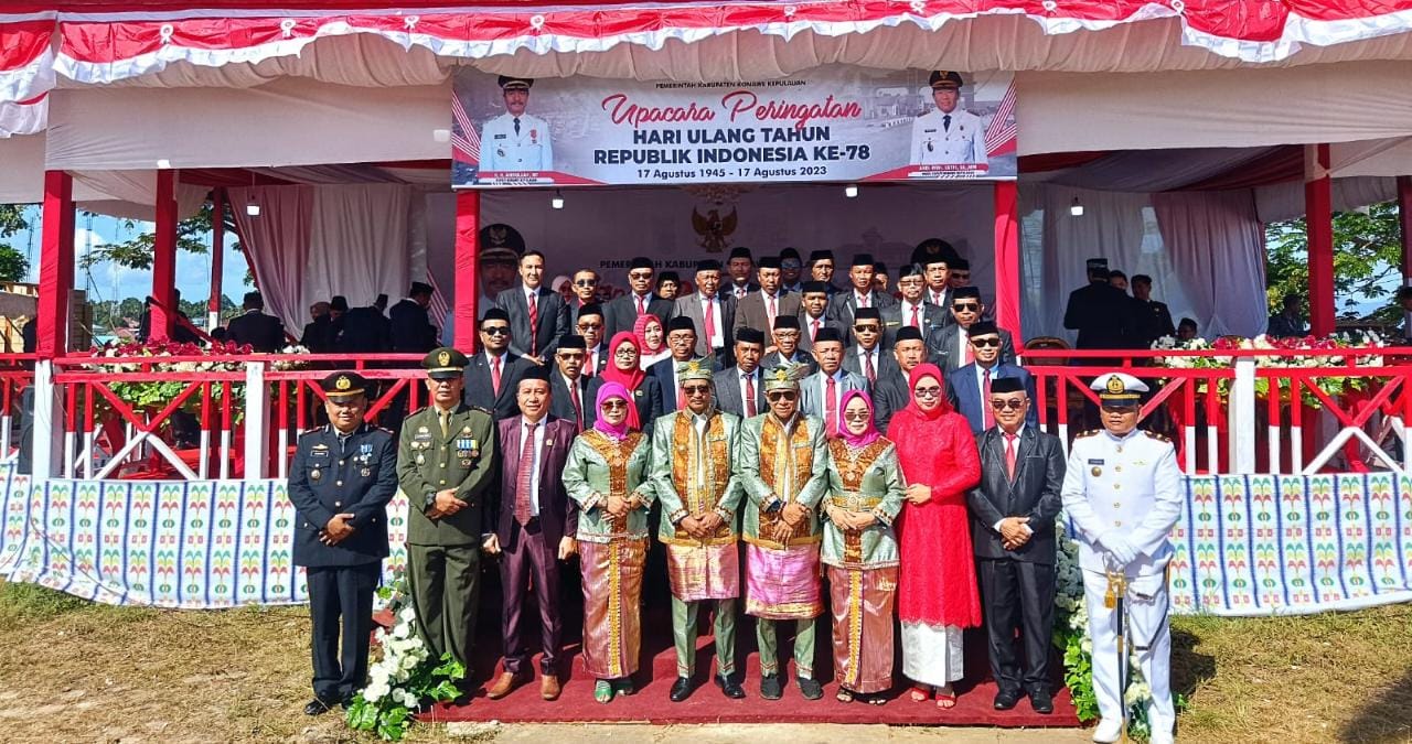 Pemda Konkep menggelar upacara kenaikan bendera di Lapangan TPI Kota Langara yang dihadiri oleh sejumlah stakeholder. Tampak Amrullah bersama wakilnya Andi Muhammad Lutfi kompak mengenakan pakaian adat kebesaran Wawonii, pada Kamis (17/8/2023).