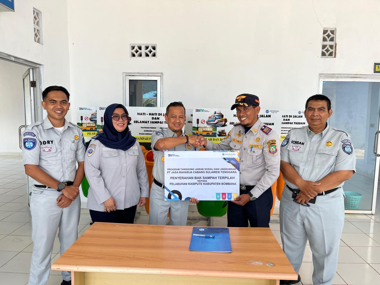 KoranMerdeka.com,Bombana – Jasa Raharja Cabang Sulawesi Tenggara (Sultra) menyerahkan bantuan bak sampah terpilah untuk Pelabuhan