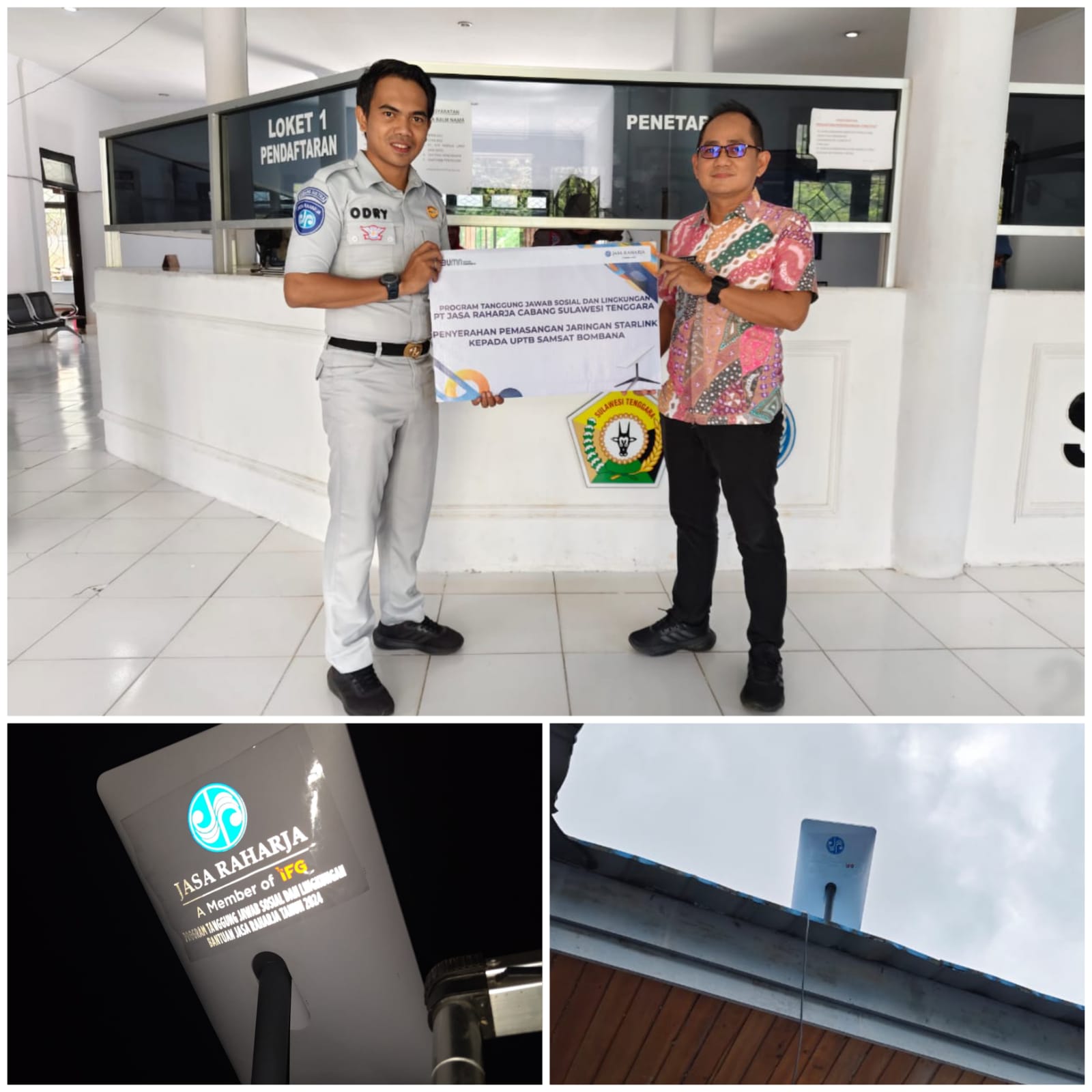 Pemasangan Alat Jaringan Starlink tersebut diserahkan Kepala Jasa Raharja Sultra yang diwakili oleh Odri Margiantara Zulkifli selaku Pelaksana Administrasi Samsat Bombana kepada Kepala UPTB Pengelolaan Pendapatan Wilayah Kabupaten Bombana, Arnold LD Putra Raya. Adapun bantuan yang diberikan sebanyak 1 unit Alat Jaringan Starlink.