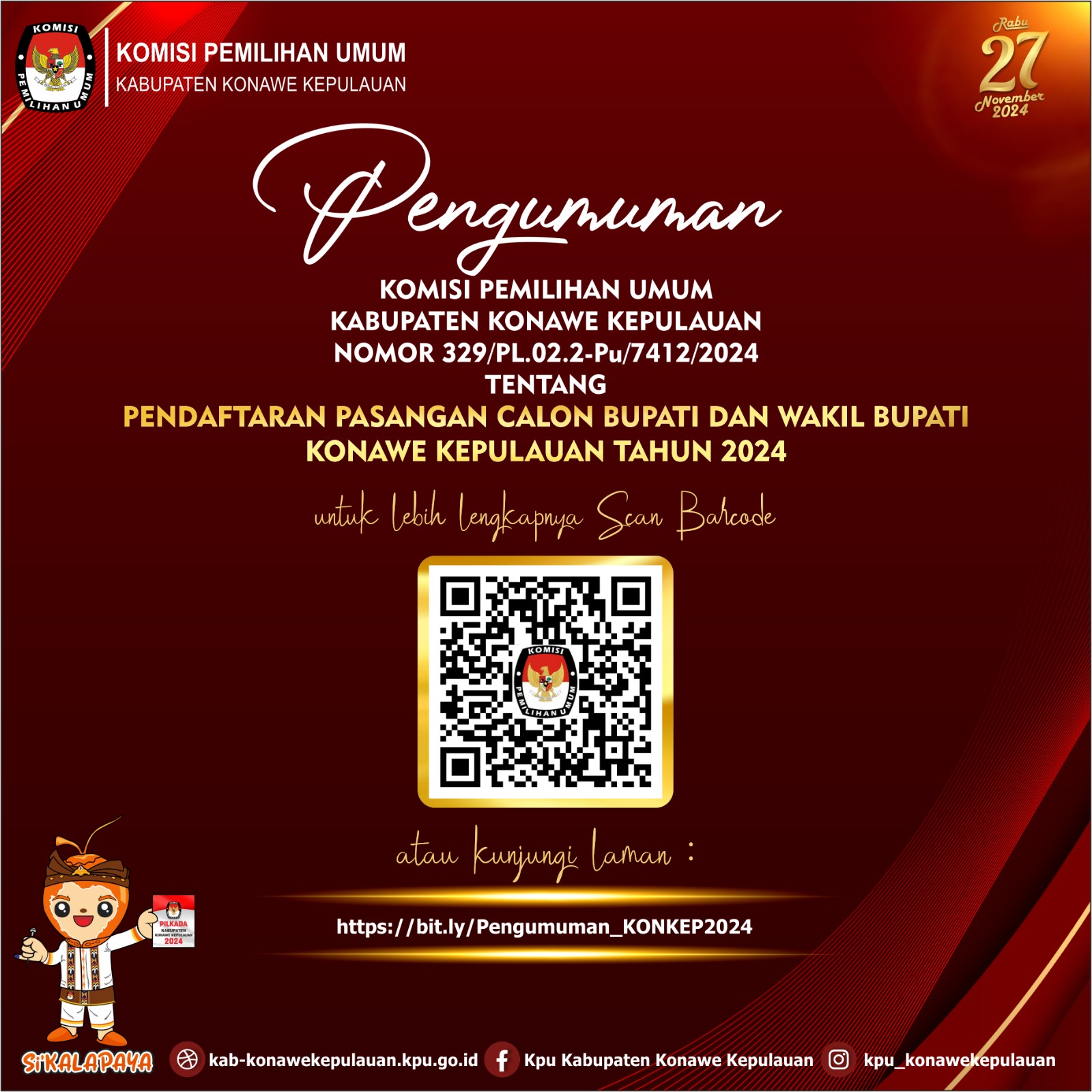 Pengumuman nomor : 329/PL.02.2-Pu/7412/2024 ini ditandatangani langsung Ketua KPU Konkep, Nasrudin tertanggal 24 Agustus 2024.