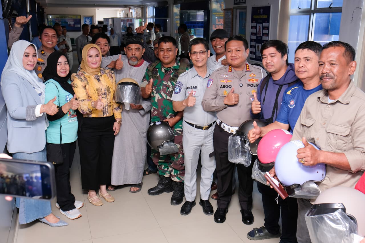 Selain itu, Jasa Raharja juga ikut serta melaksanakan doa bersama dan pembagian helm kepada masyarakat di lokasi layanan Samsat Induk. Sebanyak 25 helm di setiap titik dibagikan langsung kepada wajib pajak yang datang, disertai pesan singkat keselamatan, seperti “Hati-hati di jalan, selamat sampai tujuan!” dan “Selamat sampai di rumah, ya”. Kehangatan interaksi ini menjadi momen yang menekankan bahwa keselamatan adalah tanggung jawab bersama, dalam hal ini adalah insan Jasa Raharja, masyarakat pengguna layanan di Samsat Induk, serta stakeholder terkait.