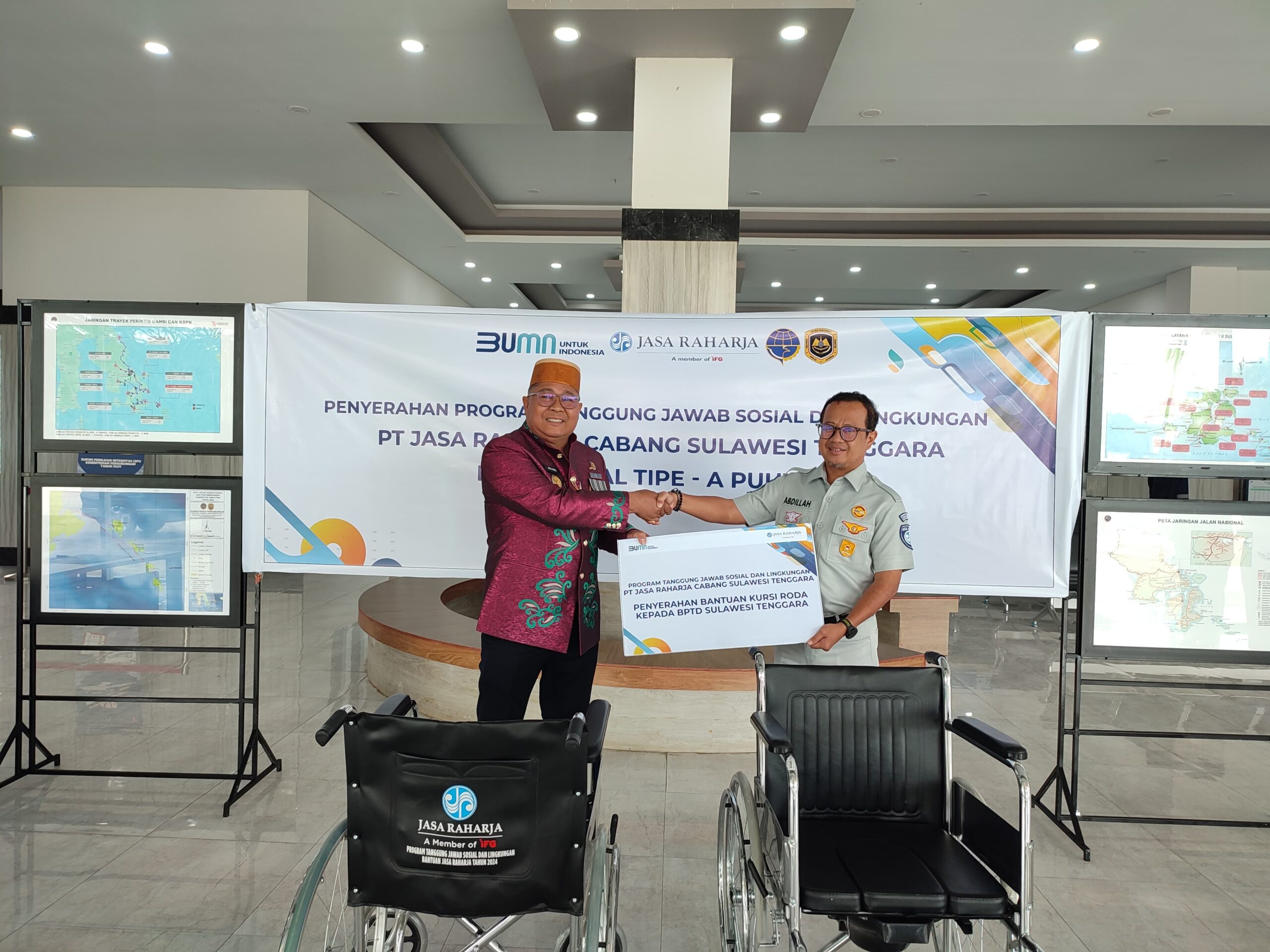 KoranMerdeka.comKendari – Kepala PT Jasa Raharja Cabang Sulawesi Tenggara, Abdillah didampingi Kepala Unit Keuangan & TJSL beserta staf, melakukan realisasi program Tanggung Jawab Sosial dan Lingkungan (TJSL), dengan menyerahkan bantuan kursi roda sebanyak 2 unit kepada Kepala Balai Pengelola Transportasi Darat (BPTD) Kelas II Sultra, Ariyandi Ariyus untuk dipergunakan di Terminal Tipe-A Puuwatu, pada Selasa (30/7/2024).