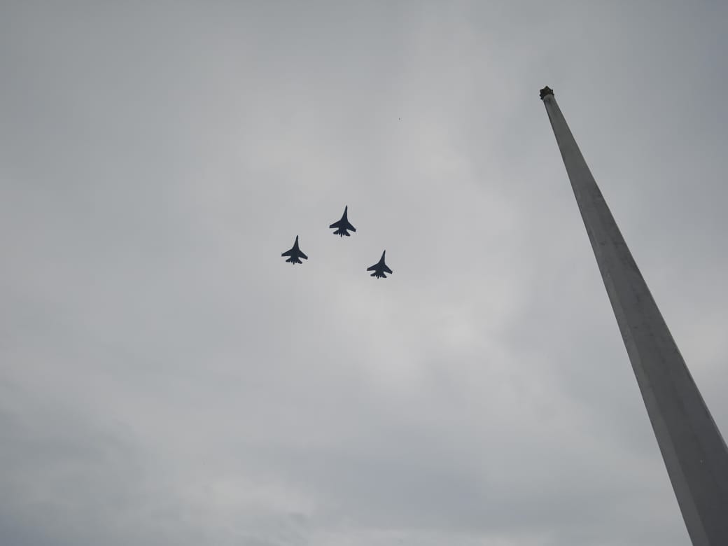 Sebanyak 5 anggota TNI Angkatan Udara dari Pasukan Khas yang diangkut pesawat Casa 212 terjun dari ketinggian 5000 kaki. Ada 5 penerjun mendarat tepat di lapangan upacara Kantor Gubernur Sulawesi Tenggara.