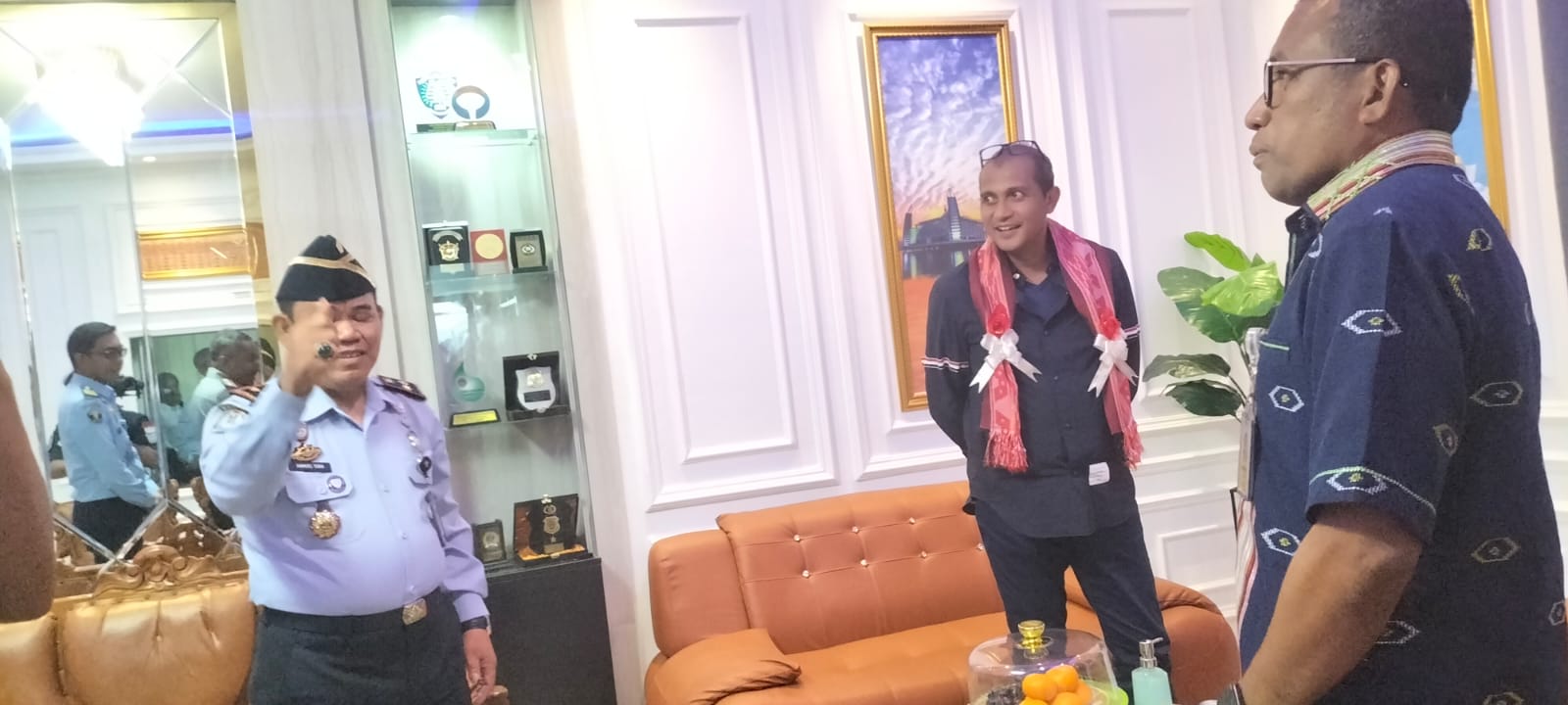 Pantauan awak media, kedatangan Wakil Menteri Hukum dan HAM di Imigrasi Kendari di sambut langsung oleh Kepala Imigrasi, Samuel Toba beserta jajarannya dengan pengalungan sal tenun khas Sultra.
